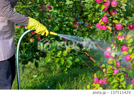 Woman watering apple tree in garden
