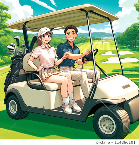 ゴルフ場でゴルフカートに乗るゴルファーの男女