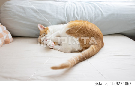 cat sleep on white blanket