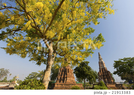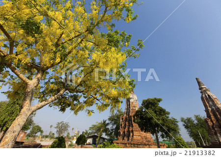 タイの黄色い花ゴールデンシャワーとアユタヤの遺跡