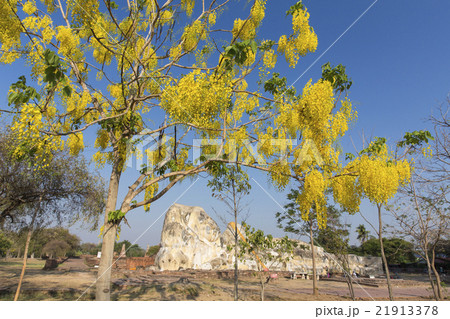 タイの黄色い花ゴールデンシャワーとアユタヤの仏像