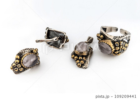 Elegant jewelry set of white gold ring, necklace and earrings with diamonds. Silver jewellery set with gemstones. Product still life concept
