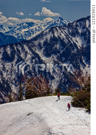 残雪の爺ヶ岳南尾根を行く登山者と槍・穂高連峰の眺め