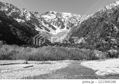 梓川から見上げる奥穂高岳 上高地自然遊歩道の散策 新聞広告用
