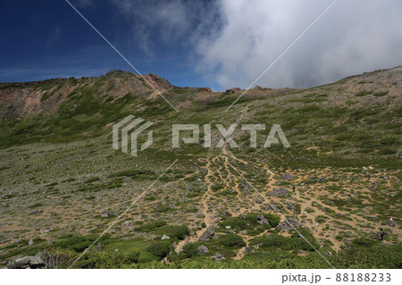 〔長野県/岐阜県・8月〕御嶽山のサイノ河原近くから見上げる、剣ヶ峰の雄々しい山容