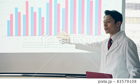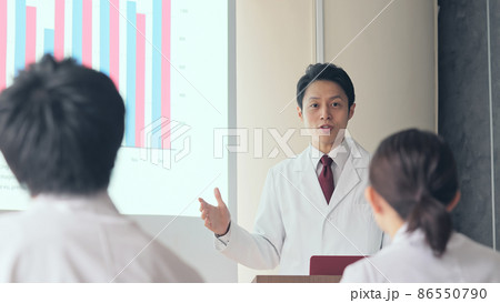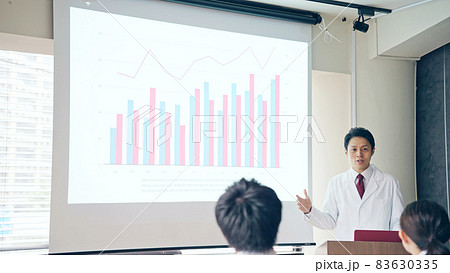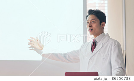 Male medical doctor standing at podium and giving a speech at a medicine conference. Presentation scientific research