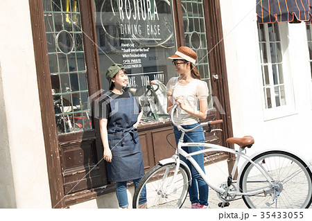 サイクルショップを覗く女性 買い物 ショッピング