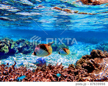 透明度の高い中部太平洋ミクロネシア、サイパンの海中の岩場に群れる熱帯の魚たち