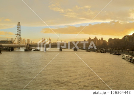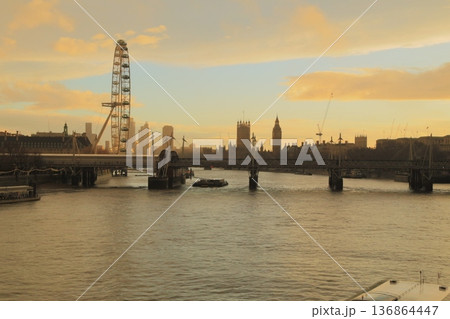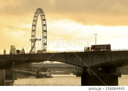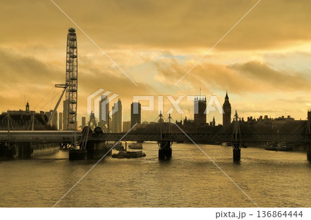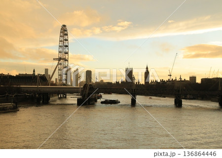 イギリス・ロンドン テムズ川沿いの夕景とロンドンアイのシルエット