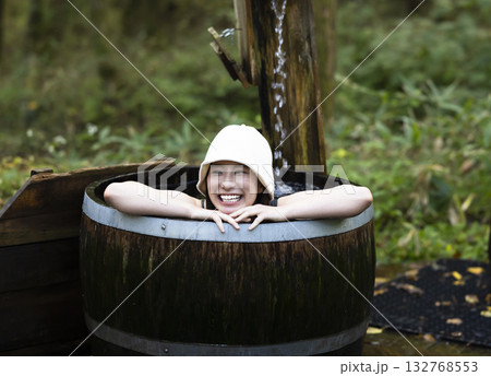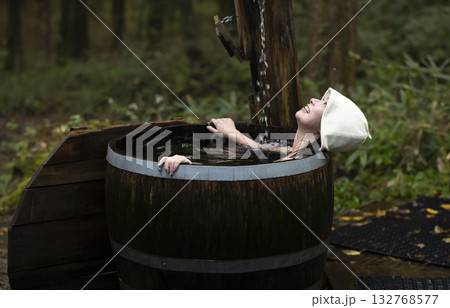 バレルサウナの水風呂に入る若い女性