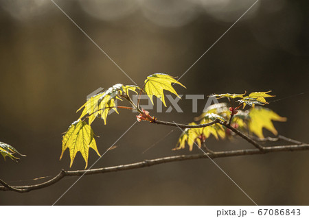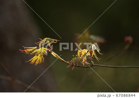 黄緑色の透き通った、葉脈が見えるサカタカエデの新芽