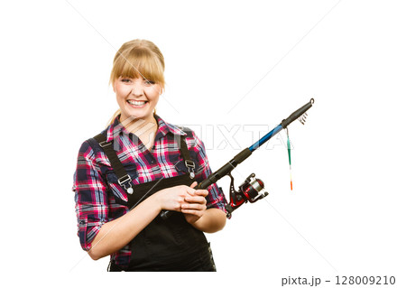 Similing woman wearing check shirt holding fishing rod