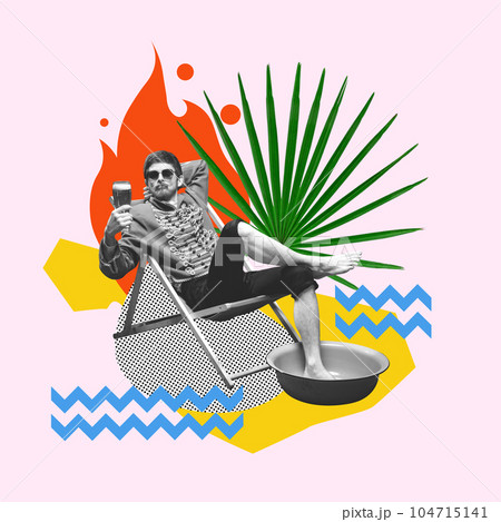 Contemporary art collage. Handsome young man in image of medieval hussar drinking beer on summer vacation. Abstract background