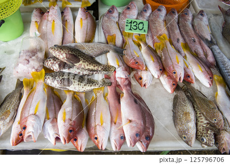 A Freshly Displayed Array of Seafood and fish on a Bustling Urban Street Setting, capturing the essence of local markets.