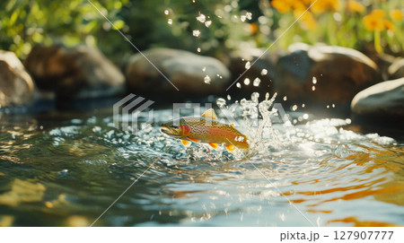 Fishing background. A fish jumping with splashing in a river water.