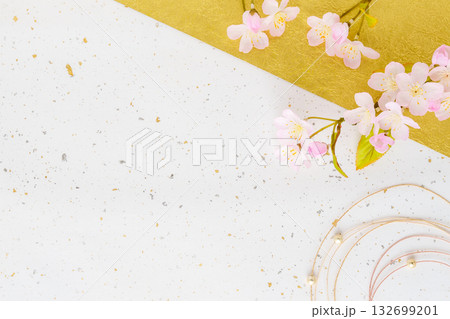 桜と金箔の入った和紙と水引の背景素材