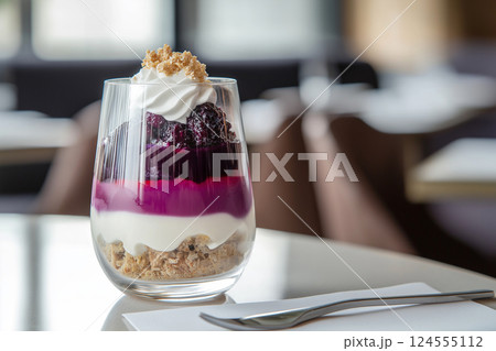 Elegant layered dessert with whipped cream, crumbs and fresh blueberries and cherries in a glass. Healthy breakfast or lunch, dieting, weight loss theme