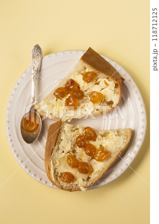 Homemade bread, butter and yellow cherry jam. Still life in a rustic style