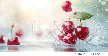 Juicy cherries splashing into clear water create refreshing scene filled with vibrant colors and dynamic movement. droplets enhance lively atmosphere