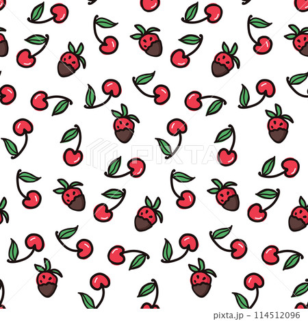 Cherry and strawberry fruit seamless pattern. Summer berries, fruits with leaves, vector background. Hand drawn doodle illustration for cover, fabric, wallpaper texture, backdrop, wedding invitation.