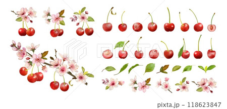 Cherry icons. Red fruit berry, organic green leaf. Nutrition healthy food, nature dessert, fresh and juicy. Isolated elements and compositions for decor packaging. Vector flat design