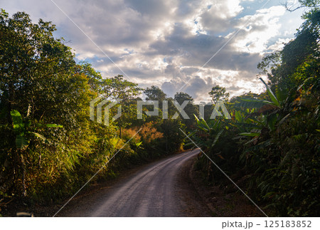 Light trails illuminating road lined with blooming cherry trees at sunset