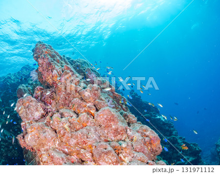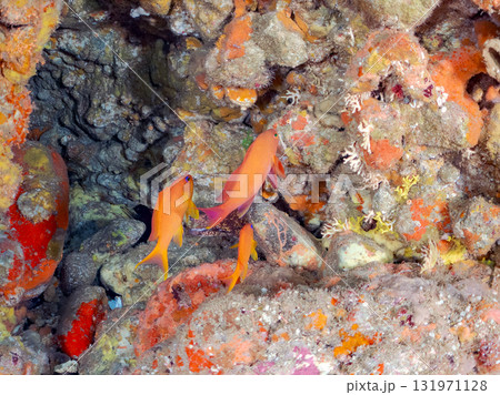 ウミカラマツが生えるドロップオフのキンギョハナダイ、ウメイロモドキ、キホシスズメダイ他の群れ