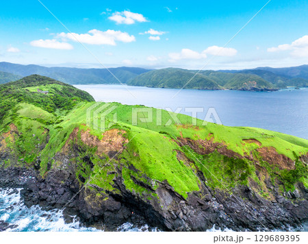 奄美大島宮古崎の先端の草に覆われた岬の景色