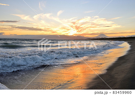 神奈川県の茅ヶ崎海岸から眺める夕日と富士山