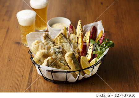 かご盛りしたフィッシュ&さつまいもチップス