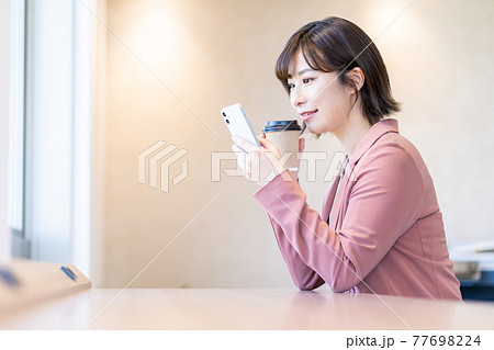 コワーキングスペースでスマホを操作する若い女性。撮影協力「+SHIFT NOGIZAKA」