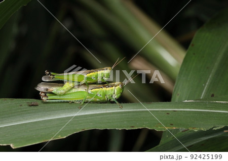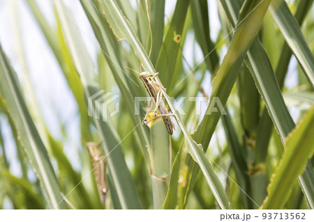 サトウキビの葉を食べるバッタ キビ食害イメージ
