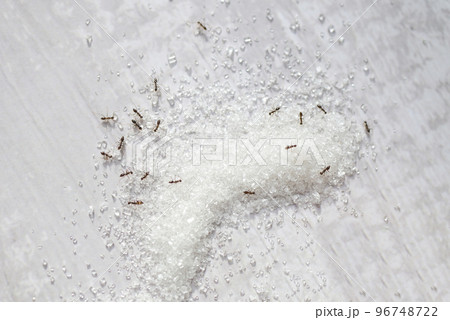 Sugar ant on table background, white sugar with ant eating sweet sugar crystalline granulated