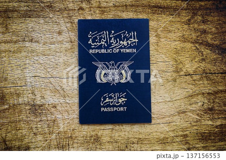 Yemeni passport on table close up. Official identification document book for citizens of Yemen. Concept of travel and tourism