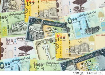 Yemeni rial paper banknotes pile on table. Yemen YER currency money bills in big amount. Concept of economics, taxation and banking in Yemen