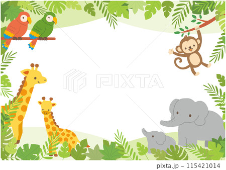 自然と動物たちのフレーム(キリン・ゾウ・サル・オウム)