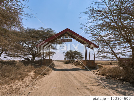 セレンゲティ国立公園のゲートと乾いた大地の風景