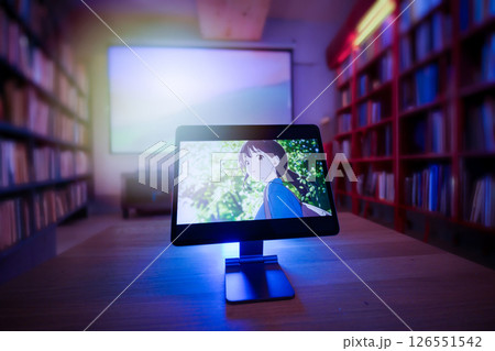Blank white screen with blurred background of bookshelf.