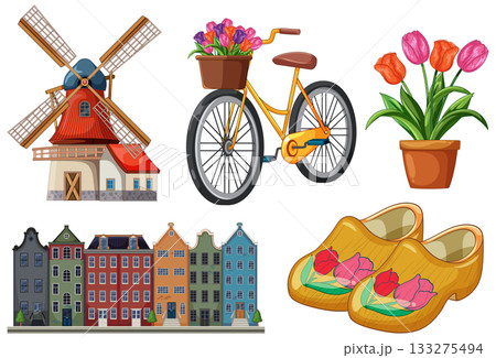 Dutch Icons Collection with Windmill, Bicycle, Tulips, and Wooden Shoes