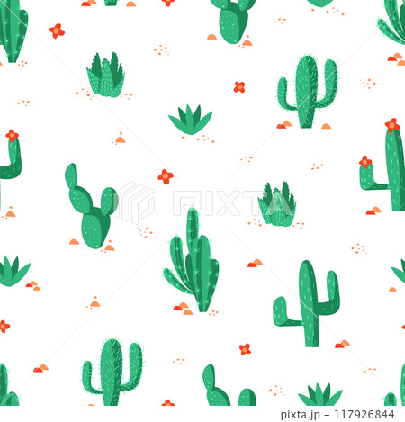 Desert seamless pattern with saguaro and giant cardon cacti. Wild American West landscape. Vector illustration