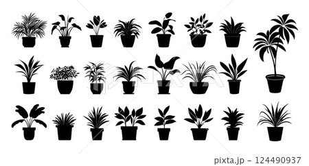 Potted plants black silhouettes. Isolated plant in pot, home decorative garden elements. Planting hobby, house office public space decorations vector set