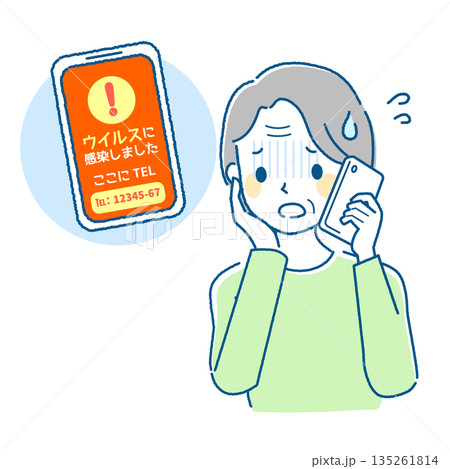 スマートフォンでネット詐欺に困惑するお年寄り女性のイラスト