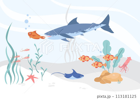Colorful underwater sea life with fish, shark, jellyfish, crab, and starfish vector illustration