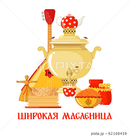 Maslenitsa. Pancake week elements - pancake, samovar, candy, balalaika, sun, scarecrow of winter, sour cream, accordion. Shrovetide.