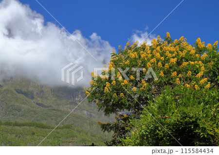 フランス海外県レユニオン島 世界自然遺産のサラジー圏谷のエルブール村の花と山の景色