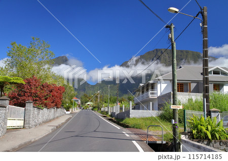 フランス海外県レユニオン島 世界自然遺産のサラジー圏谷のエルブール村の建物と山の景色