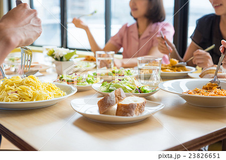 Eating food. people eating Italian food Pasta, Pizza, Salad on the table.