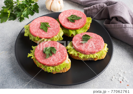 Sandwiches with lettuce leaves and sliced salami sausage on black plate.