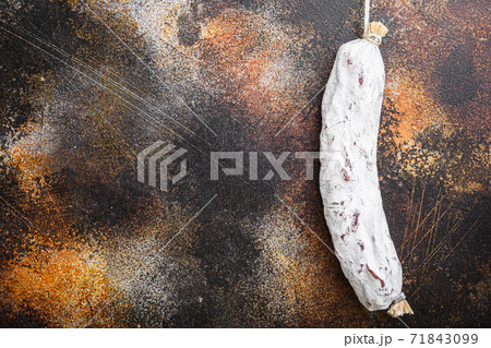 Salchichon sausage on dark background, flat lay with copy space