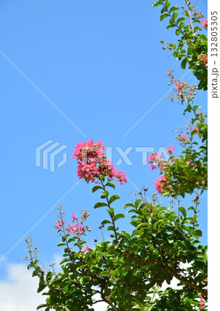 夏の日ざしを浴びたサルスベリ(青空と百日紅の花とつぼみ)
